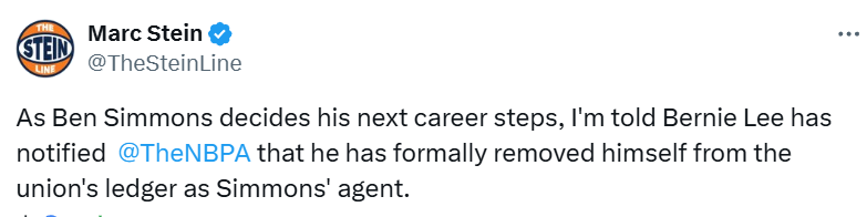 北京时间9月5日,据NBA名记Stein报道,经纪人伯尼-李已告知球员工会,他不再担任本-西蒙斯的经纪人。目前,29岁的本-西蒙斯正权衡自己的下一步计划,其中包括退役的可能。
